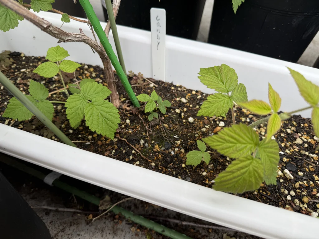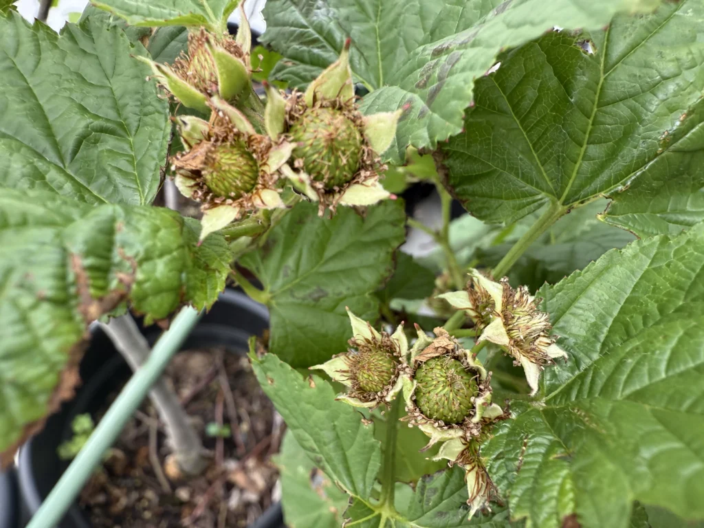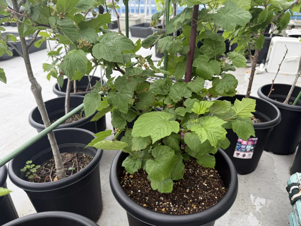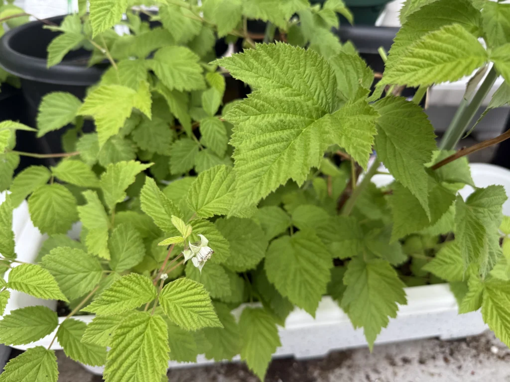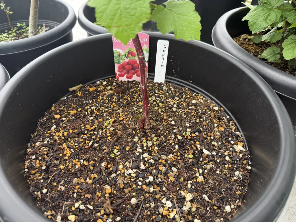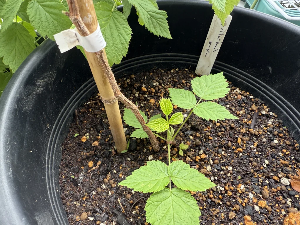 画像は1年目のレッドドリーム苗ですが、こちらに関しては自立してくれるので問題ないものの、ラズベリーは基本的に自立しないものが大半なので、他のラズベリーたちは鉢の周りに3本のリング支柱を立てたりして対策しています。